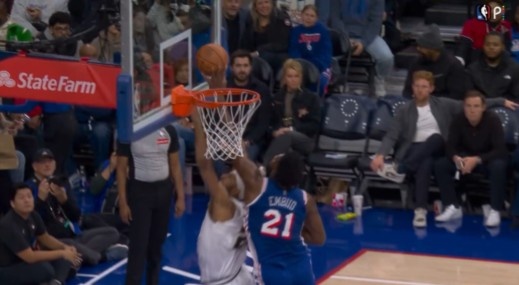 足球比赛直播-这也行?恩比德明显干扰球裁判没吹 好像还动手拉纳吉球衣了